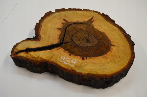Zdjęcia robimy od razu po przecięciu, żeby jak najlepiej pokazać w jaki sposób można wyprowadzić plaster i podkreślić jego strukturę. W procesie suszenia naturalną rzeczą są pęknięcia materiału powstałe w skutek oddawania wilgoci oraz powierzchowna zmiana barwy. Jedno ze zdjęć pokazuje aktualny stan plastra z początku sierpnia.