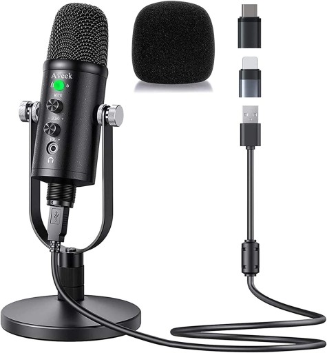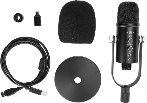 1 x mikrofon, 1 x kabel do transmisji danych, 1 x pokrowiec z gąbki, 1 x adapter typu c, 1 x instrukcja, 1 x podstawa, 1 x wspornik