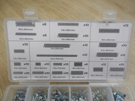- Zestaw zawiera: Sprężyny: 10 x (7x38 mm), 10 x (7x51 mm), 8 x (8x28.5 mm), 10 x (8x31.5 mm), 12 x (8x44.5 mm)