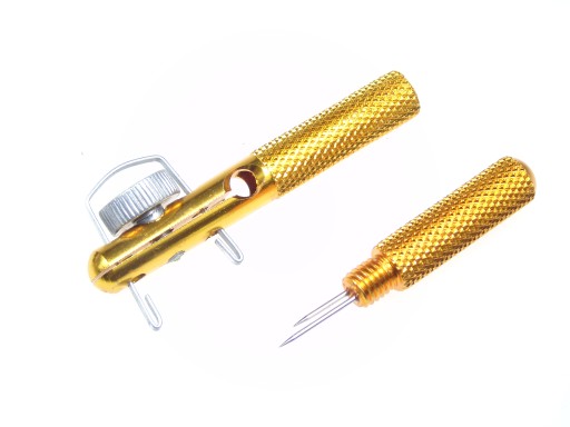 Narzędzie dzięki któremu wiązanie haczyków z łopatką staje się prostsze. Poręczna, łatwa w obsłudze, wykonana z duraluminium. Dodatkowo dwie igły(dłuższa i krótsza) posłużą do szybkiego zawiązania równych pętelek i haczyków z oczkiem.