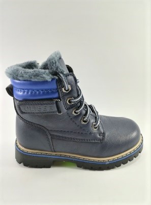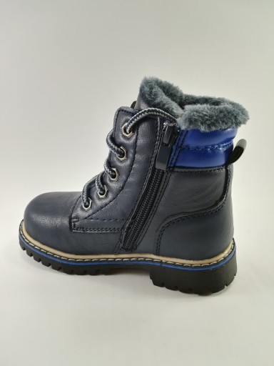 Dziecięce trzewiki marki Clibee w kolorze granatowym. Wierzch wykonany ze skóry ekologicznej, wnętrze wyłożone kożuszkiem. Model sznurowany, co pozwala na dopasowanie tęgości, dodatkowo wyposażony w zamek na boku co ułatwia wkładanie. Zapiętek usztywniony. Grubszy spód (1,5-2,5 cm) oraz wyższa cholewka (10 cm) skutecznie chronią przed chłodem. Idealna propozycja na sezon zimowy.