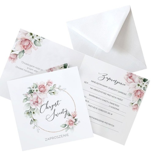 - skład: zaproszenia na Chrzest dziewczynki do samodzielnego wypisywania z grafiką różowych kwiatów (10szt) oraz koperty w kolorze białym
