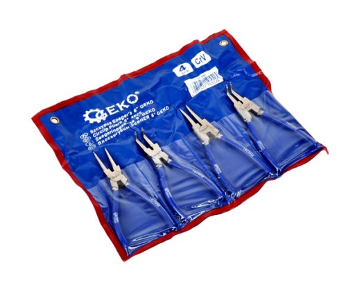 Komplet zawiera seger prosty wewnętrzny i prosty zewnętrzny oraz seger wygięty wewnętrzny i wygięty zewnętrzny.