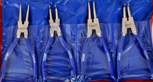 Komplet zawiera seger prosty wewnętrzny i prosty zewnętrzny oraz seger wygięty wewnętrzny i wygięty zewnętrzny.