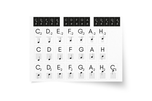 Wytrzymałe naklejki samoprzylepne na klawisze (37 sztuki). Naklejki wyeliminują częsty problem, z zapamiętywaniem nazw klawiszy. Zawierają zarówno oznaczenia literowe klawiszy (C, D, E, F, G, A, H) jak i oznaczenia nutowe – dzięki temu oprócz zapamiętywania nazw klawiszy, samoistnie zaczniesz zapamiętywać także nuty – co może przydać się w późniejszej, bardziej zaawansowanej nauce gry.
