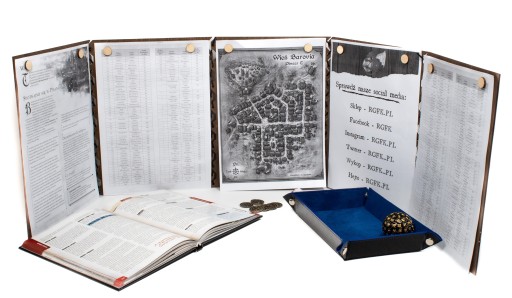 - ekran mistrza gry, który składa się z drewnianych części A4 i rzemyków. Ekran należy złożyć samodzielnie, jednak nie jest to zadanie trudne i zazwyczaj nie zajmuje więcej niż dwie minuty.