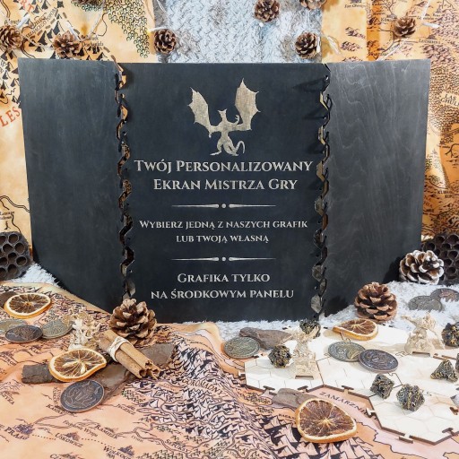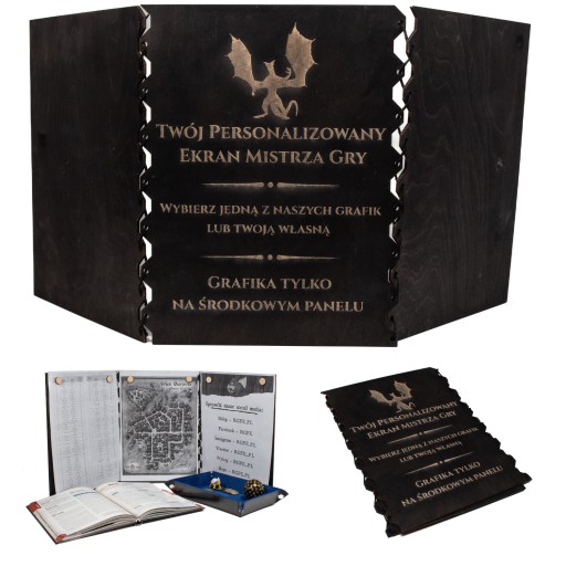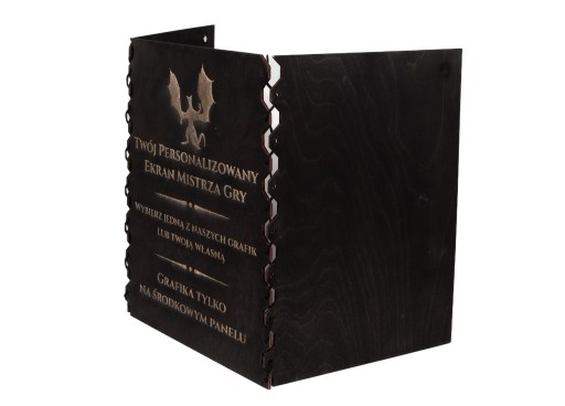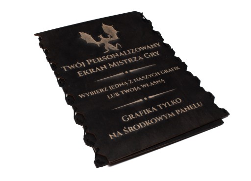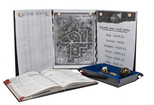 - ekran mistrza gry, który składa się z drewnianych części A4 i rzemyków. Ekran należy złożyć samodzielnie, jednak nie jest to zadanie trudne i zazwyczaj nie zajmuje więcej niż dwie minuty.