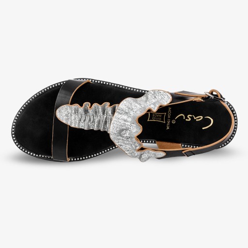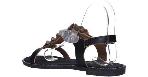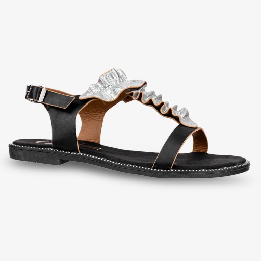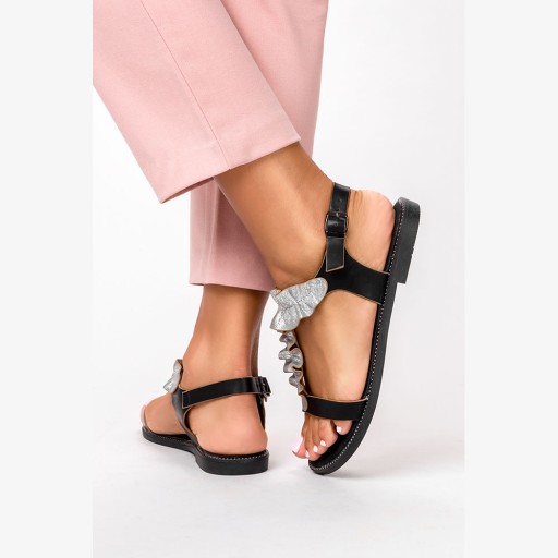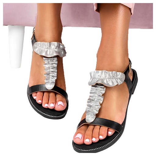 Czarne sandały płaskie z nitami i ozdobną falbanką Casu K19X6/B
