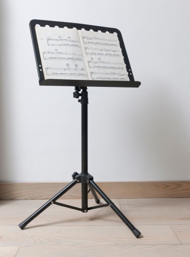 ♫ Profesjonalny pulpit koncertowy na nuty. Jest stabilny i solidny. Posiada regulację wysokości oraz dwa chwytaki przytrzymujące nuty/kartki, dzięki czemu nie spadną nieoczekiwanie z pulpitu. Sprawia to też, że można korzystać z niego na dworze. Cały statyw jest bardzo dobrze wykonany i wybornie się prezentuję podczas wydarzeń.