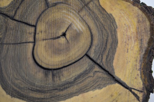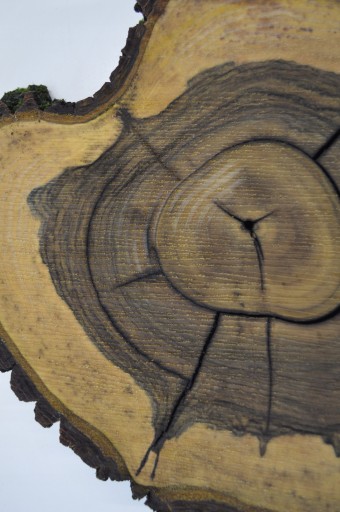 Zdjęcia robimy od razu po przecięciu, żeby jak najlepiej pokazać w jaki sposób można wyprowadzić plaster i podkreślić jego strukturę. W procesie suszenia naturalną rzeczą są pęknięcia materiału powstałe w skutek oddawania wilgoci oraz powierzchowna zmiana barwy. Jedno ze zdjęć pokazuje aktualny stan plastra z początku sierpnia.