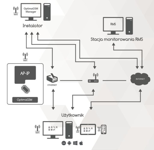 OptimaGSM umożliwia wydzielenie 4 indywidualnych stref i obsługę do 32 użytkowników (administrator + 31 użytkowników). Każdemu z nich można przypisać indywidualne uprawnienia, określające możliwość manipulacji systemem.