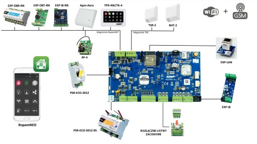 - Wbudowany moduł Wi-Fi i moduł GSM do realizacji powiadomień i zdalnego sterowania