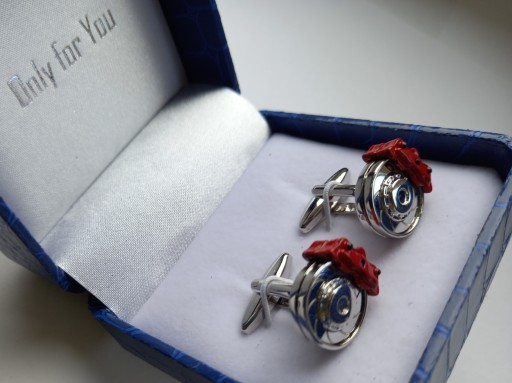 Modny zestaw pary spinek do mankietów koszuli w postaci miniaturki Tarczy Hamulcowej z ruchomymi zaciskami Brembo, wyprodukowany przez naszą manufakturę spinek. Projekt z limitowanej serii "Only for You" Tylko dla Ciebie zapakowany w ekskluzywne etui z wzorem wężowej skóry.