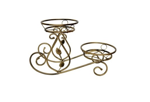 Kwietnik na dwie doniczki. Kwietnik jest trwale i estetycznie wykonany z metalu zdobiony kutymi liśćmi. Może stanowić element dekoracyjny wnętrza mieszkania lub biura. Precyzyjnie wykonane metalowe elementy kwietnika dopasują się praktycznie do każdego stylu.