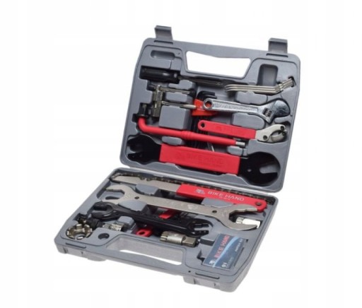 Zestaw narzędzi 19 pozycji: śrubokręt krzyżowy, śrubokręt płaski, łyżki do opon 3 szt, klucz nastawny, rozkuwacz łańcucha, klucze imbusowe 2/2,5/3/4/5/6mm, klucz płaski 8/10 mm, klucz imbusowy 8mm, klucz do misek mechanizmu, klucz do pedałów, klucz do kaset łańcuchowy, klucz do nakrętek sterów 30/32/36/40mm, klucz do nakrętki kasety, klucz do misek mechanizmu (hakowy), 2 x klucz płaski 13/14/15 /16mm do przeciw nakrętek osi, klucz do osi mechanizmu B.B, ściągacz do korby, klucz do szprych 9G-15G, zestaw naprawczy dętki, producent: BIKE HAND