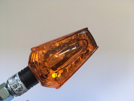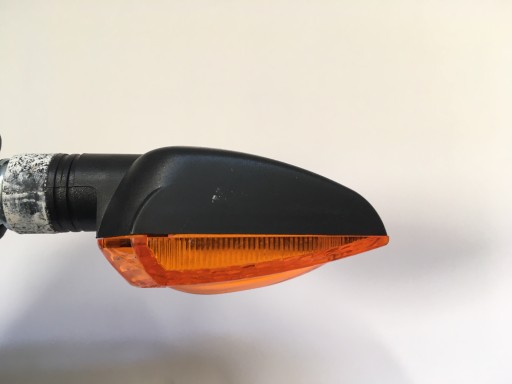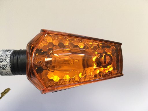 Kierunkowskaz z obudową plastikową, kształt podłużny, pomarańczowy klosz.