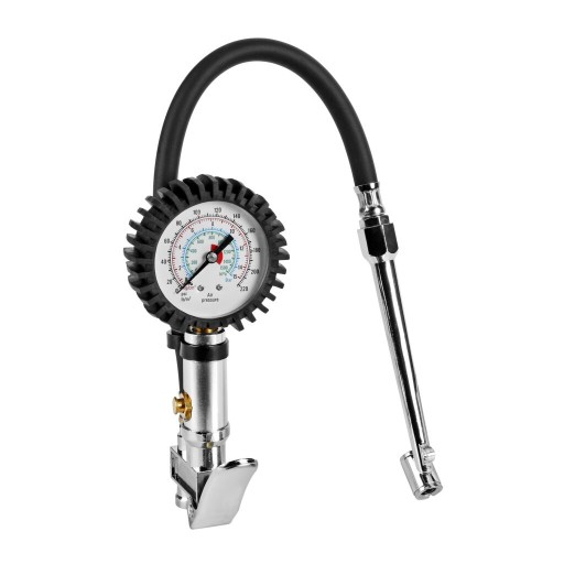 Pistolet do pompowania wyposażony w manometr z dokładną podziałką 0-10 bar, wąż gumowy i podwójny nypel.