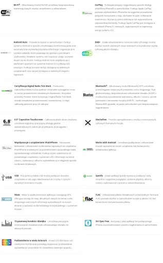 Wyposażony w Wi-Fi odtwarzacz multimediów z 6,8-calowym pojemnościowym ekranem dotykowym bez napędu i możliwością łatwego podłączenia smartfona. Zapewnia obsługę Apple CarPlay (bezprzewodowo) i Android Auto (bezprzewodowo) oraz USB Mirroring (iPhone i Android). Bluetooth, radio cyfrowe DAB/ DAB+, 13-pasmowy korektor graficzny, zaawansowane funkcje audio oraz najwyższa jakość dźwięku.