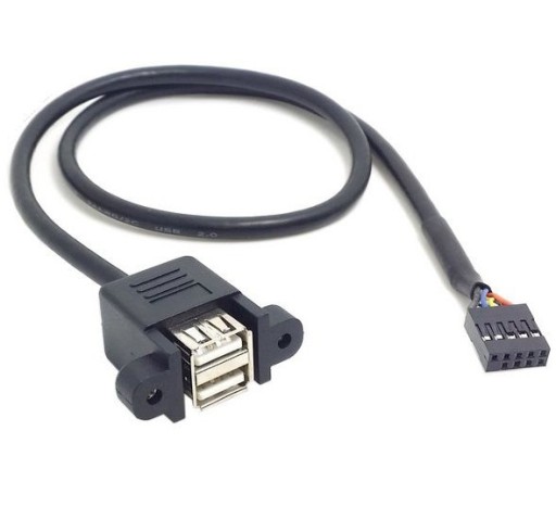 Podwójne gniazdo USB (gniazda jedno pod drugim) typu A przeznaczone do montażu w obudowach, urządzeniach itp. Posiada przewód o długości 30cm zakończony gniazdem 2x5pin.