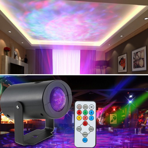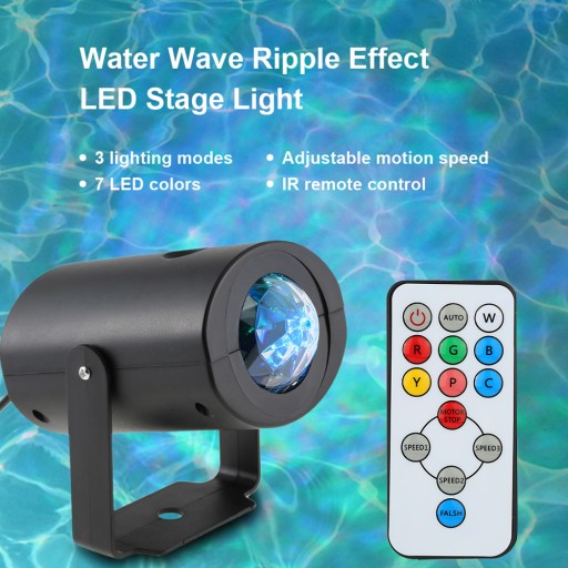 Ten mini LED etap światło o fali wody odzew może przynieść wspaniałe efekty wizualne. Automatycznie uruchomiony, kolor statyczne i tryb lampy błyskowej RGB zrobić to bardzo praktyczne w użyciu, a to naprawdę idealnym miejscem, aby Państwa etapem kolorowe i radosne.