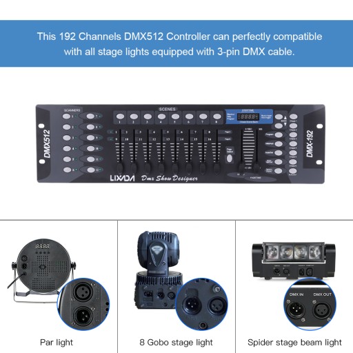 Ten element jest standardowym uniwersalnym kontrolerem DMX512, sterującym do 192 kanałów DMX. Jest specjalnie zaprojektowany, aby kontrolować wiele efektów świetlnych jednocześnie bez wysiłku. To idealna równowaga pomiędzy kosztami, łatwością obsługi i niezwykłymi cechami. Jest idealny dla tych, którzy naprawdę chcą wykorzystać ich oświetlenie i efekty. Świetnie nadaje się do DJ'ów, koncertów szkolnych lub każdej regularnej imprezy. Dzięki kontrolerowi DMX będziesz mógł dostosować efekty świetlne, aby idealnie dopasować się do atmosfery i dźwięku.