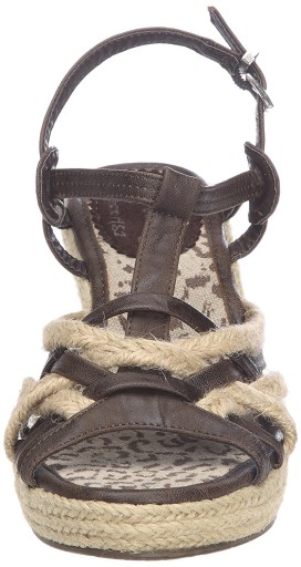 Brązowe sandały z kolekcji firmy MUSTANG. Sandały wykonane ze skóropodobnego tworzywa w połączeniu z materiałem, w środku znajduje się wyściółka tekstylna, podeszwa to wysokogatunkowe tworzywo. Model na koturnie, z paseczkiem zapinanym przy kostce, z przodu platforma, obcas na sznurku. Zachęcam do zakupu!