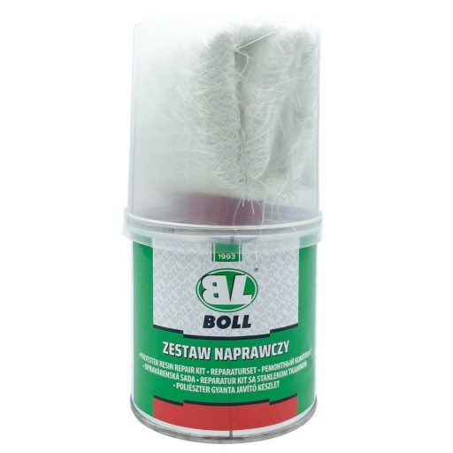 BOLL zestaw naprawczy składa się z żywicy poliestrowej (242 g), utwardzacza (8 g) oraz maty szklanej (0,25 m2)