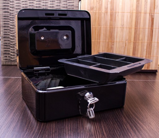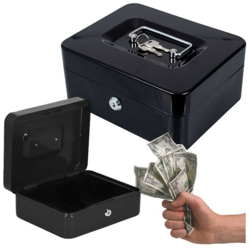 Metalowa kasetka z zamknięciem na kluczyk to doskonały sposób na przechowywanie małych i dużych kwot, dokumentów i innych drobnych przedmiotów. Wyposażona została w półkę z przegródkami, dzięki którym można łatwo segregować monety.