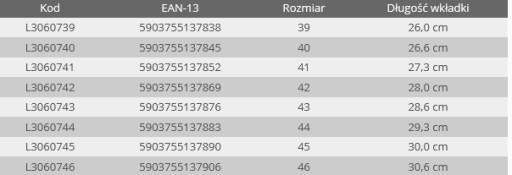 Wyściółka: wymienna (wkładki z elastyczną poduszką tłumiącą wstrząsy oraz podkładką łagodzącą nacisk stopy na podłoże).