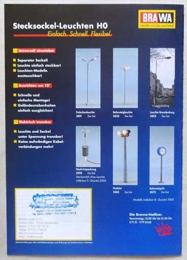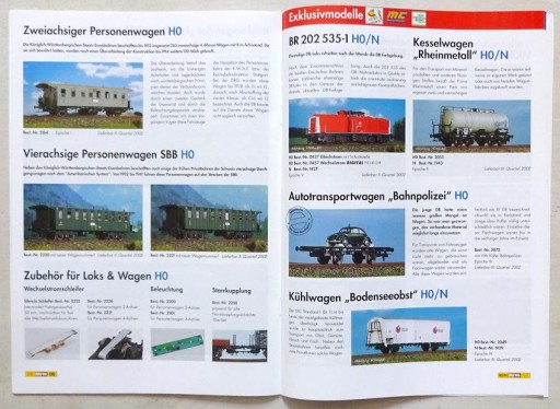 Sprzedaję unikatowy prospekt modeli kolejowych Brawa „Neuhiten 2002” – skale H0 i N. 24 strony. Język niemiecki. Stan bardzo dobry z minusem – niewielkie ślady użytkowania. Zapraszam na inne moje aukcje.