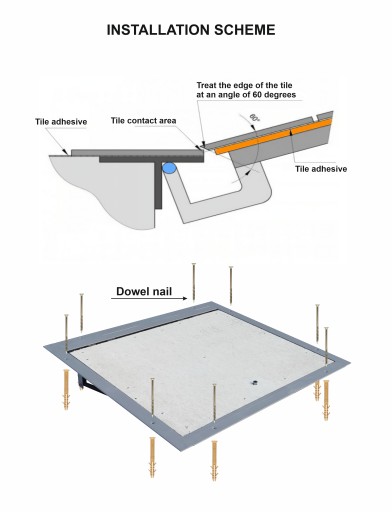 Właz rewizyjny podłogowy jest montowany przed montażem podstawowego wykończenia podłogi. Jest przymocowany do podstawy podłogi i zamknięty pokrywą od góry. Osłona niewidocznego włazu podłogowego umożliwia mocowanie na nim wszystkich rodzajów istniejących materiałów wykończeniowych podłogi – płytek, laminatu, parkietu, gresu i innych powłok .