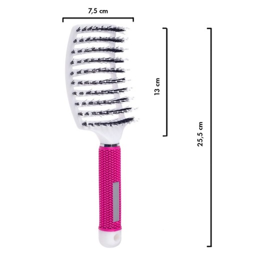 Szczotka wykonana z włosia mieszanego - włosie z dzika oraz nylonowe, wzmacnianego igiełkami nylonowymi o zaokrąglonych końcach. Idealna do rozczesywania każdego rodzaju włosów, zarówno na sucho jak i na mokro. Gęste włosie zapewnia włosom wyjątkową gładkość i połysk po czesaniu.