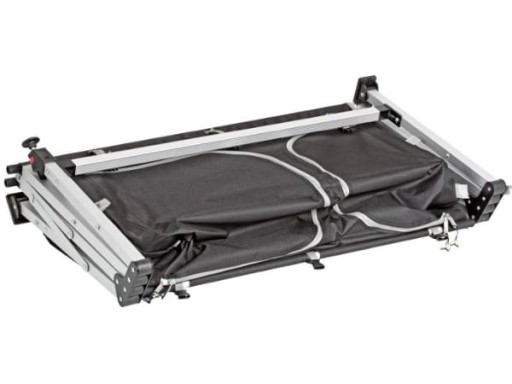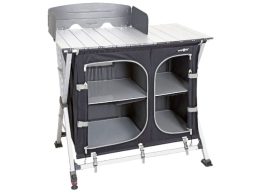 Nowa koncepcja wielofunkcyjnej szafkii o konstrukcji Cross z rurowego aluminium. 1 stopka z regulacją wysokości, obrotowa i o takich wymiarach, aby uniknąć zapadania się w miękkim podłożu. Wyposażona w 2 oddzielne przegrody (4 półki) i wytrzymały aluminiowy blat (system Gapless) ze zintegrowaną poziomicą. Szafka charakteryzuje się dużą wytrzymałością, wszechstronnością zastosowania jak i nowoczesnym wyglądem. Idealna do gotowania w przedsionku, namiocie lub markizie przyczepy kempingowej czy kampera. Pokrycie z bardzo wytrzymałego materiału syntetycznego z obustronną powłoką. Odporna na ścieranie, łatwa do czyszczenia i elegancka.