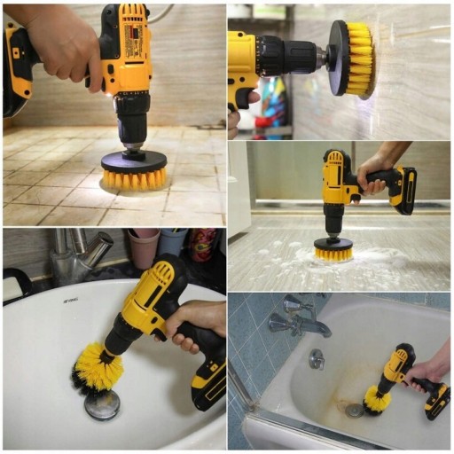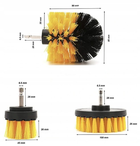 Zestaw 3 szczotek z mocowaniem na wiertarkę lub wkrętarkę. Szczotki są wykonane ze średniej twardości nylonu, który podczas użytkowania nie rozchodzi się na boki, a włosie, z którego są zrobione nie wypada.
