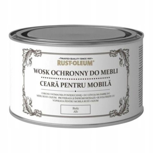 Wosk Rust-Oleum White Forniture Finishing Wax to postarzający wosk z niewielką ilością barwnika, dający efekt wyługowanego, poblakłego drewna. Dedykowana do aplikacji na farby do drewna Rust-Oleum. Wosk nadaje aksamitny połysk, natomiast sukcesywne polerowanie doda głębi i uszlachetni powierzchnię. Wosk jest wykończeniem i jednocześnie zabezpieczeniem odpornym na wilgoć, skutecznie izolując struktury drewna np. od rozlanych płynów, które spłyną bądź pozostaną na powierzchni do wytarcia. Ponadto wszelkie oznaki codziennego użytkowania bardzo łatwo usunąć przy pomocy bawełnianej szmatki - to proste i wygodne..:) Dla podniesienia skuteczności ochrony mebli Woskiem aplikację należy powtarzać raz na jakiś czas.
