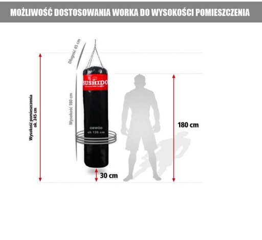 Wysokość worka wynosi 180 cm umożliwiając zarówno trening bokserski jak i trening kopnięć. Wysokość całkowita łącznie z łańcuchami wynosi ok. 220 cm.
