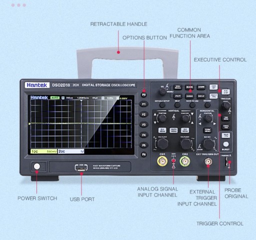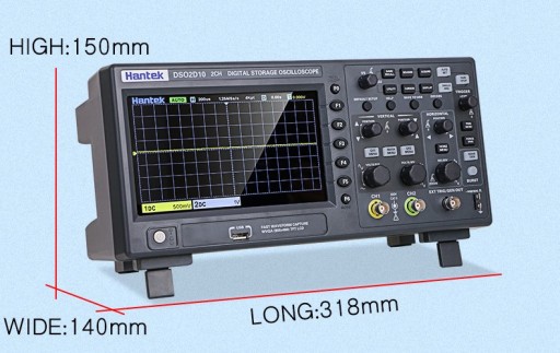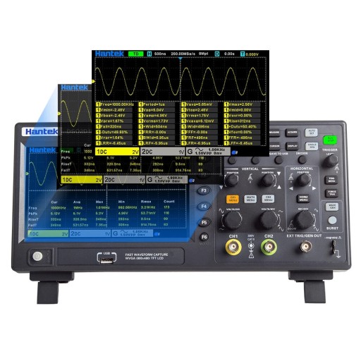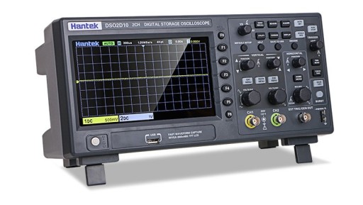 Nowa seria oscyloskopów DSO2000 Hantek: DSO2D10 to cyfrowy oscyloskop oferujący dwa kanały wejściowe z szerokością pasma 100MHz i dodatkowo wbudowanym generatorze funkcyjnym o maksymalnej częstotliwości przebiegu 25MHz. Oscyloskop posiada przetwornik o częstotliwości próbkowania 1GSa/s, rekordem pamięci 8M. Oprogramowanie sterujące pracą oscyloskopu umożliwia samonastawę AUTOSET, automatyczny pomiar 32 parametrów napięciowo-czasowych, dekodowanie magistral szeregowych, analizę FFT, pracę w trybie X-Y, zapis przebiegów, komunikację z komputerem PC. Obsługuje komendy zdalnego sterowania SCPI.