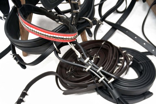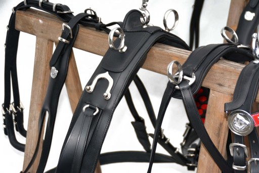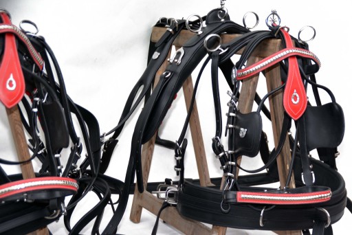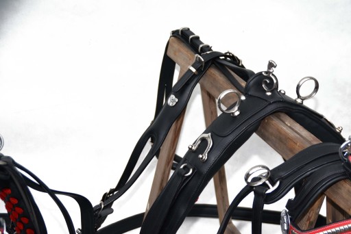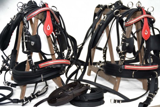 Uprząż na parę koni roz.FULL . Uprząż wykona w całości bardzo dobrej selekcjonowanej skóry licowej ,bardzo miękkiej i miłej w dotyku ,we wszystkich elementach uprzęży wszyta taśma ,która ma zadanie wzmocnienie skóry.Profilowane piersi wyposażone w napierśniki ,popręgi anatomicznie profilowane ogłowia anatomiczne w części potylicznej i nachrapnik zrobiony na miękko Okucia wykonane ze stali nie rdzewnej .jedyna taka uprząż na rynku ,perfekcyjnie wykonanie.Polecam