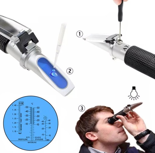 Kompaktowy, optyczny tester płynów eksploatacyjnych samochodu. Umożliwia błyskawiczny pomiar zawartości elektrolitu w baterii akumulatora oraz temperatury zamarzania płynów chłodniczych i tych na bazie glikolu. Wystarczy pobrać próbkę płynu za pomocą pipety, umieścić próbkę na panelu kontrolnym refraktometru i odczytać wskazanie za pomocą wizjera.