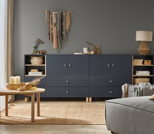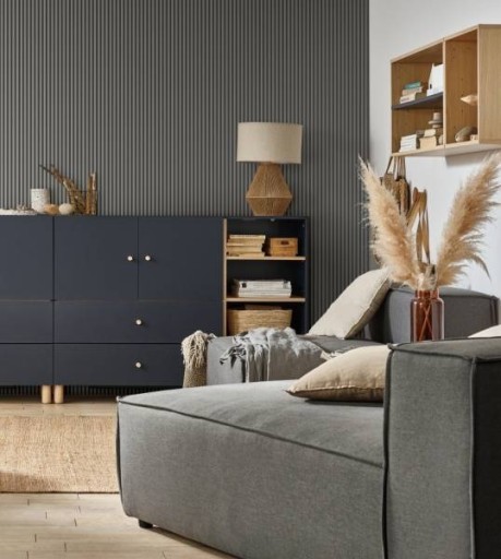 Szare panele lamelowe Linerio S-Line zamontowane na całej wysokości ściany, nadają pomieszczeniu lekkości i optycznie je podwyższają. Pozwalają wyróżnić fragment pokoju oraz poprawić akustykę. Wąskie monochromatyczne panele są efektownym dodatkiem nowoczesnych aranżacji. Mogą zostać na ścianie lub suficie. Są wytrzymałe oraz łatwe w montażu.
