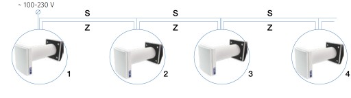 Szeregowe połączenie urządzeń zapewnia efektywną i zbilansowaną wentylację. Urządzenie pierwsze (1) w szeregu jest głównym urządzeniem sterującym. Sterowanie systemem wietrzenia (urządzenia 2, 3, 4 ...) odbywa się za pomocą panelu sterującego, znajdującego się na pierwszym/głównym urządzeniu sterującym. Sygnał z pilota odbierany jest tylko przez pierwsze/główne urządzenie sterujące.