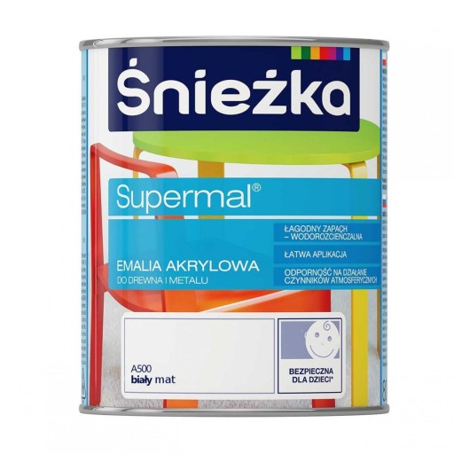Emalia akrylowa SUPERMAL®przeznaczona jest do dekoracyjno-ochronnego malowania drewna, materiałów drewnopochodnych, tynków oraz elementów stalowych i żeliwnych użytkowanych wewnątrz i na zewnątrz pomieszczeń, takich jak: drzwi, okna, meble itp.