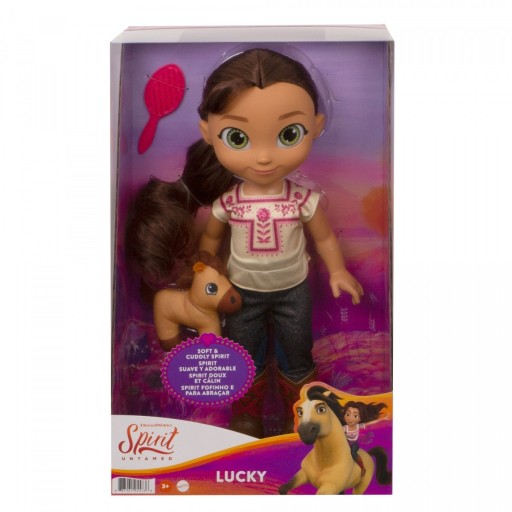 Poczuj atmosferę przyjaźni, odwagi i przygody znaną z animacji Mustang: Duch wolności! Duża lalka na dobranoc Lucky (ok. 35,5 cm) ma 5 punktów zgięcia, które pozwalają ustawiać ją w dynamicznych pozach. Jest doskonała do przytulania i trzymania w rączkach, a do tego ubrana w uroczy strój: dżinsy, buciki i wyszywaną koszulkę z materiału. W zestawie jest też słodka przytulanka: pluszowy konik Duch! Dołączona jest również szczotka, która pozwala do woli czesać włosy Lucky. Kolory i elementy dekoracyjne mogą się różnić. To wspaniały prezent dla dzieci od 3 roku życia.