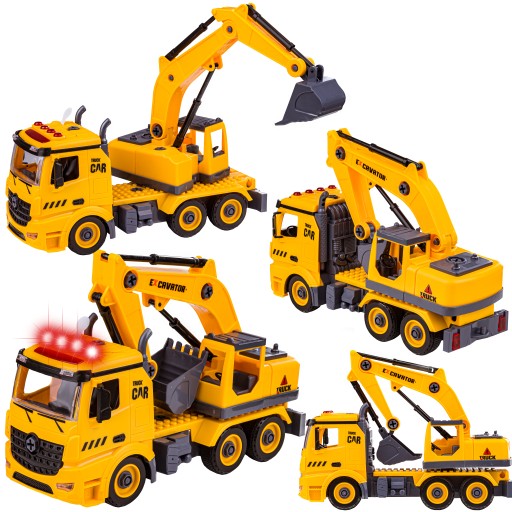 Zestaw wyposażony został w wymienne elementy - dzięki czemu w zależności od potrzeb na placu budowy nasza ciężarówka może przemienić się w betoniarkę, koparkę lub dźwig z ruchomym hakiem. Każdy z elementów można rozkręcić na mniejsze części.
