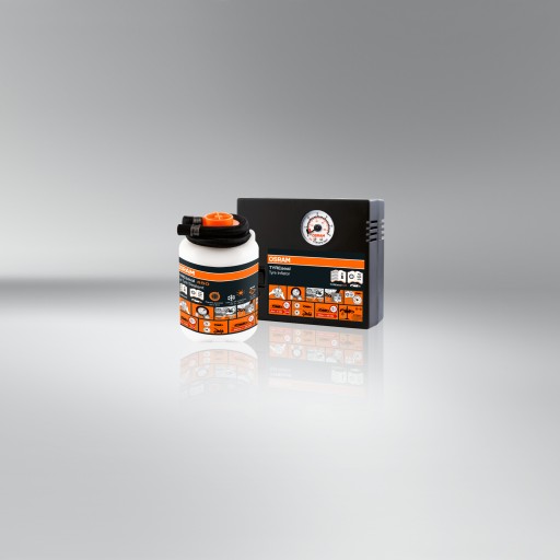 OSRAM TYREseal KIT zawiera butelkę żelu uszczelniajacego o pojemności 450ml, kompresor i pokrowiec, może być używany jako zamiennik fabrycznego wyposażenia uszczelniającego od producenta. OSRAM TYREseal KIT pozwala uszczelnić opony z przebiciami o średnicy do 6mm* dzięki technologii żelu cząsteczkowego, a potem napompować je przy użyciu kompresora dołączonego do zestawu. Po uszczelnieniu opony żelem OSRAM TYREseal 450 możesz kontynuować podróż na odległość do 200 km. Uszczelniacz do opon można wypłukać i naprawić oponę, co pozwoli na sporą oszczędność kosztów. Uszczelnienie uszkodzonej opony można wykonać szybko i łatwo, bez narzędzi i podnośników, dzięki czemu możesz wznowić podróż w ciągu zaledwie 10 minut.W porównaniu z uszczelniaczami piankowymi, formuła uszczelniacza firmy OSRAM została zaprojektowana tak, aby była kompatybilna z systemem monitorowania ciśnienia w oponach pojazdu (TMPS). Dzięki wykorzystanej technologii nie ma konieczności wyjmowania rdzenia zaworu podczas stosowania uszczelniacza.