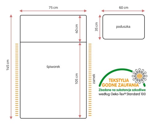 2) śpiworka zapinanego z dwóch boków na zamek, o rozmiarze 145x75cm (+/- 2cm)