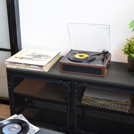 Fenton RP170D to stylowy zestaw gramofonu i dopasowanego etui na płyty w świetnym stylu retro. Pomimo wyglądu retro, gramofon nie ustępuje innym współczesnym odtwarzaczom. Jest wyposażony w Bluetooth, wbudowane wysokiej jakości głośniki, funkcję automatycznego zatrzymania i wiele prędkości, dzięki czemu może odtwarzać wszystkie rodzaje płyt winylowych.