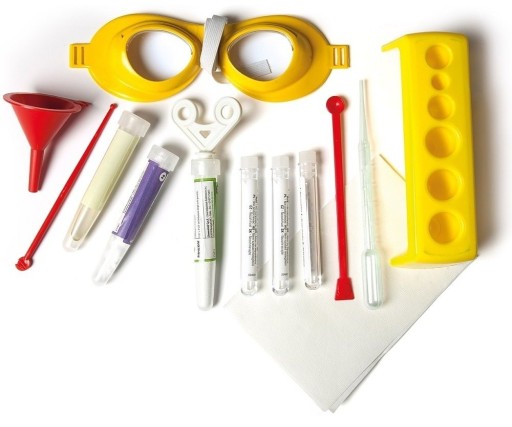 Przy pomocy tego naukowego zestawu będziesz mógł odkryć tajniki tej fascynującej dziedziny nauki. Wykorzystaj probówki i mikstury, aby przeprowadzić ekscytujące i całkowicie bezpieczne eksperymenty. Zaimponuj przyjaciołom. Zawiera kompletny zestaw przyrządów laboratoryjnych i wiele innych substancji do obserwacji, eksperymentów i prawdziwych reakcji chemicznych. Nie odpowiednie dla dzieci poniżej 8 roku życia. Do używania pod nadzorem osoby dorosłej.