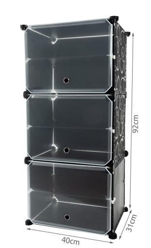 - SPECYFIKACJA – w zestawie 3 moduły; możliwość złożenia według własnej koncepcji: tak; materiał: tworzywo sztuczne; 6 półek: tak; otwierane drzwi: tak; metalowy stelaż: tak; wymiary (wys/szer/gł):92/40/31cm; waga: 3kg; waga w opakowaniu: 3,5kg.