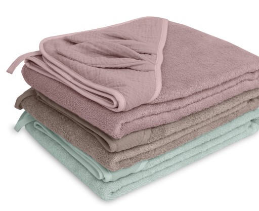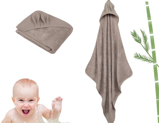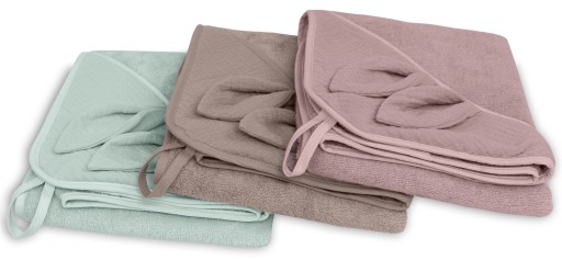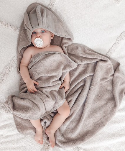 ➡️ Okrycie kąpielowe uszyte z grubej i mięsistej tkaniny bambusowej i bawełny. Posiada muślinowy kapturek wykończony dekoracyjnymi uszkami.